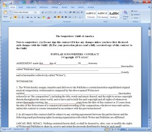 Word .DOC Format. FREE!!! Popular Songwriter Agreement from the American Guild of Authors and Composers (AGAC). This is a publishing agreement from the Artist's point of view. View the contract by clicking the 'Download' tab in the product detail page.
